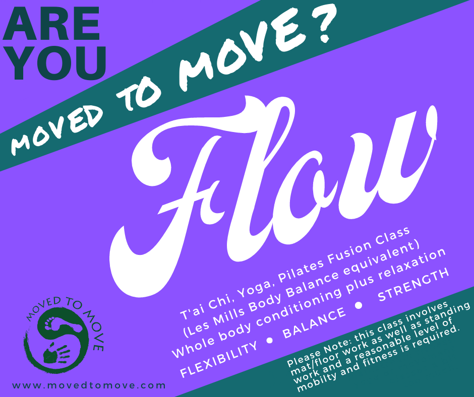 MOVEDtoMOVE's FLOW class offers an all round feel-good fusion of body conditioning, flexibility and relaxation as well as creating a great balance between mind and body. It's also a class that just makes Carolyn smile! Movements in these classes are based on T'ai Chi, Yoga and Pilates elements. Option for an evening FLOW class upon request.